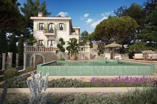 In the center of the garden, there is a swimming pool made of beige stone decorated with golden mosaics. The pool is equipped with a waterfall, counterflow, Jacuzzi and heating, as well as technical equipment for use without chemicals and chlorine. A luxurious stone bench with flowerpots and carved stone backs made of rare young marble near the pool create a magnificent ensemble. The depth of the pool allows you to enjoy both sports swimming and relaxation. Outdoor furniture by the pool is made by special order and designed to blend harmoniously into the overall atmosphere of the house.