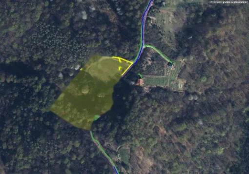 A plot of land with an area of 11,434 m2, located in the Lesce region, is offered for sale. The object's status is a land plot with a predominance of a forest zone and partially a water area. The site consists of 62% of the forest area, which is designated as a forest (detailed functional area G), and 38% of the water area (detailed functional area VC). There is a water source on site.